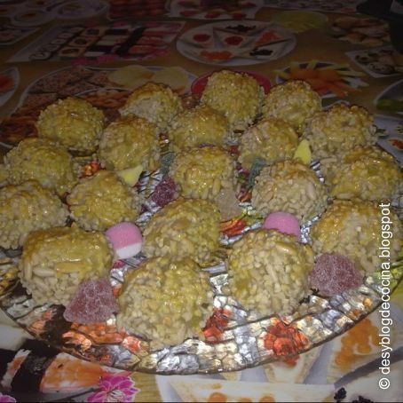 Las yemas las vertimos en la mezcla de antes, removiendo hasta conseguir que se mezclen todos los ingredientes. A continuación empezamos a hacer bolitas con la masa. Esas bolitas las pasaremos primero por la clara de huevo y luego por los piñones, que habremos puesto en un platito