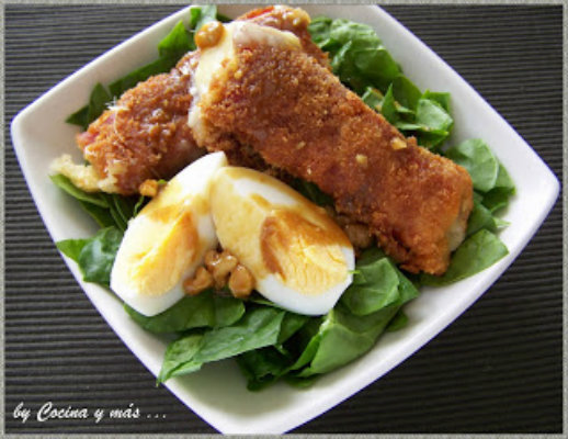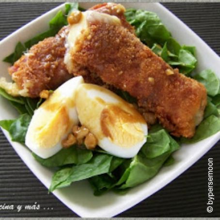 Presentamos colocando en el fondo del plato las hojas de espinaca, encima los rollitos de jamón con dos trocitos de huevo duro y aliñamos con la vinagreta.