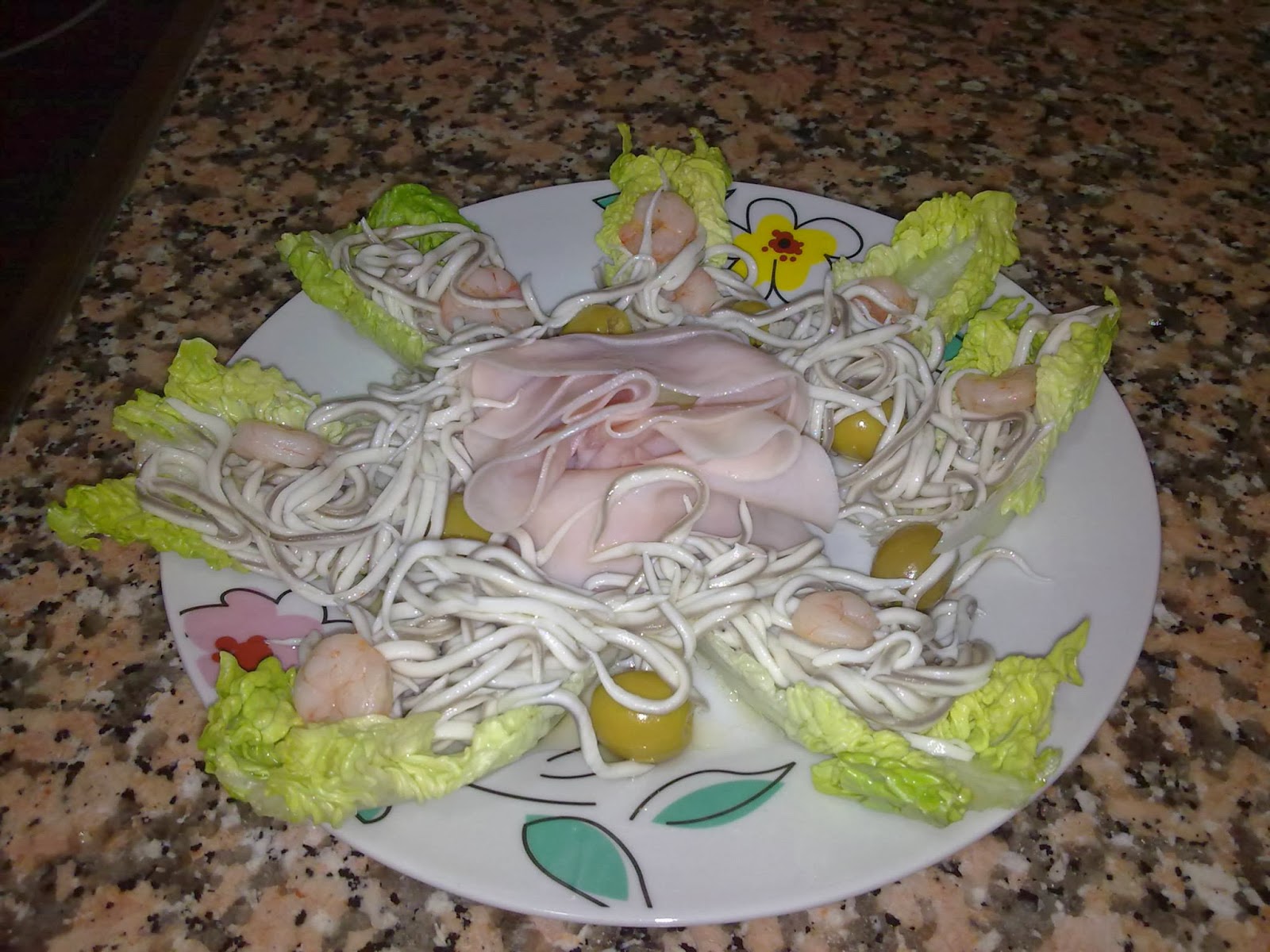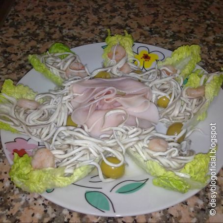 añadimos unas aceitunas repartida s por el plato y en el centro ponemos las finas lonchas de jamón de pavo, en forma de rosa, dobladas. como en la foto.