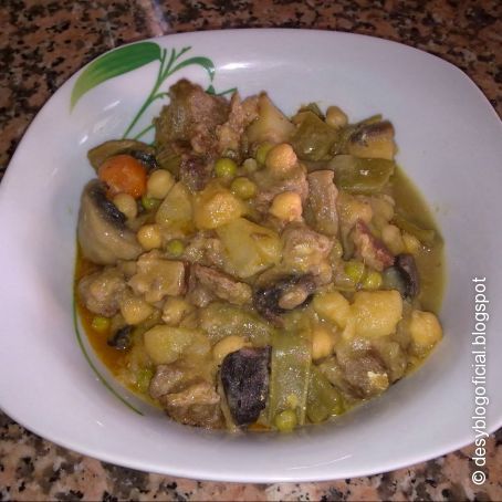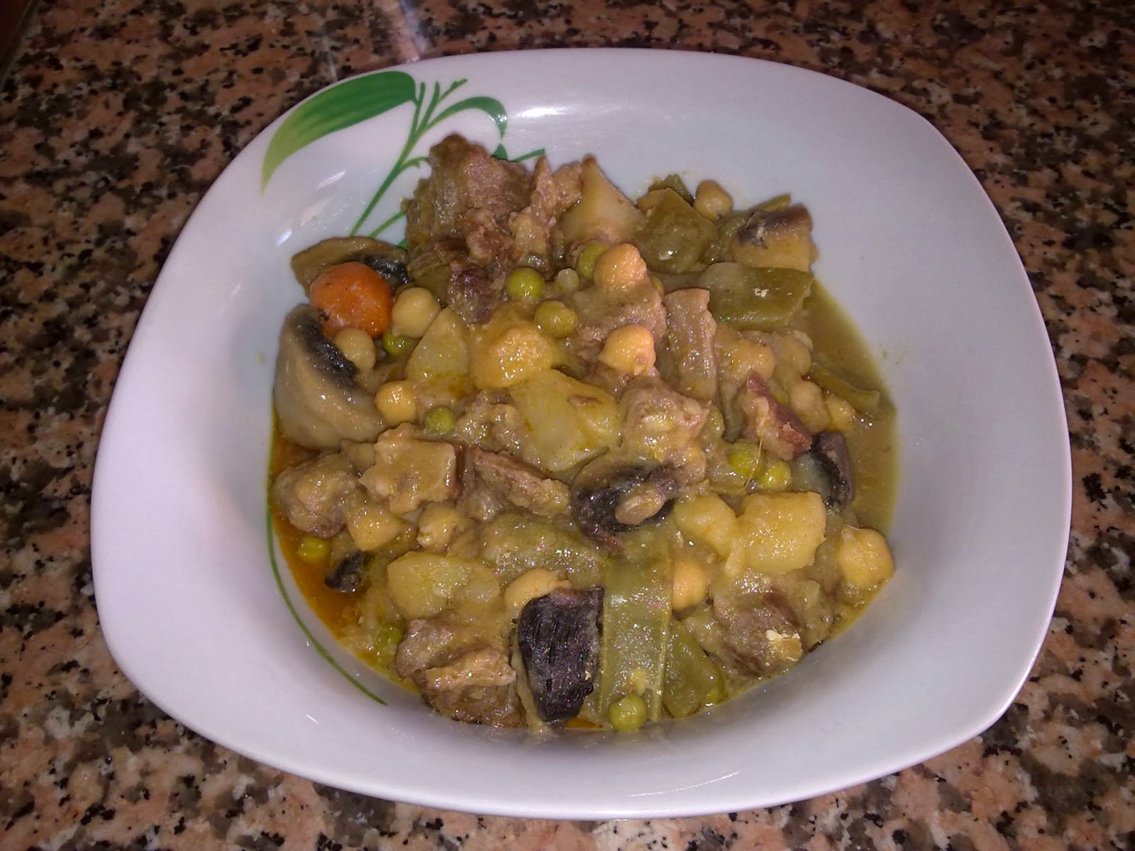 Ha llegado la hora de añadir los champiñones, los dejamos que vayan soltando un poquito de agua y cuando reduzcan y esten medio hechos añadimos las patatas,las judías, las zanahorias, le añadimos el caldo de cocido y tapamos. Hemos de dejarlo así unos 45-50 minutos. Cierra bien la tapa con el tapón de la olla a presión, asegurate, sino puede saltar la tapa y provocar un accidente.