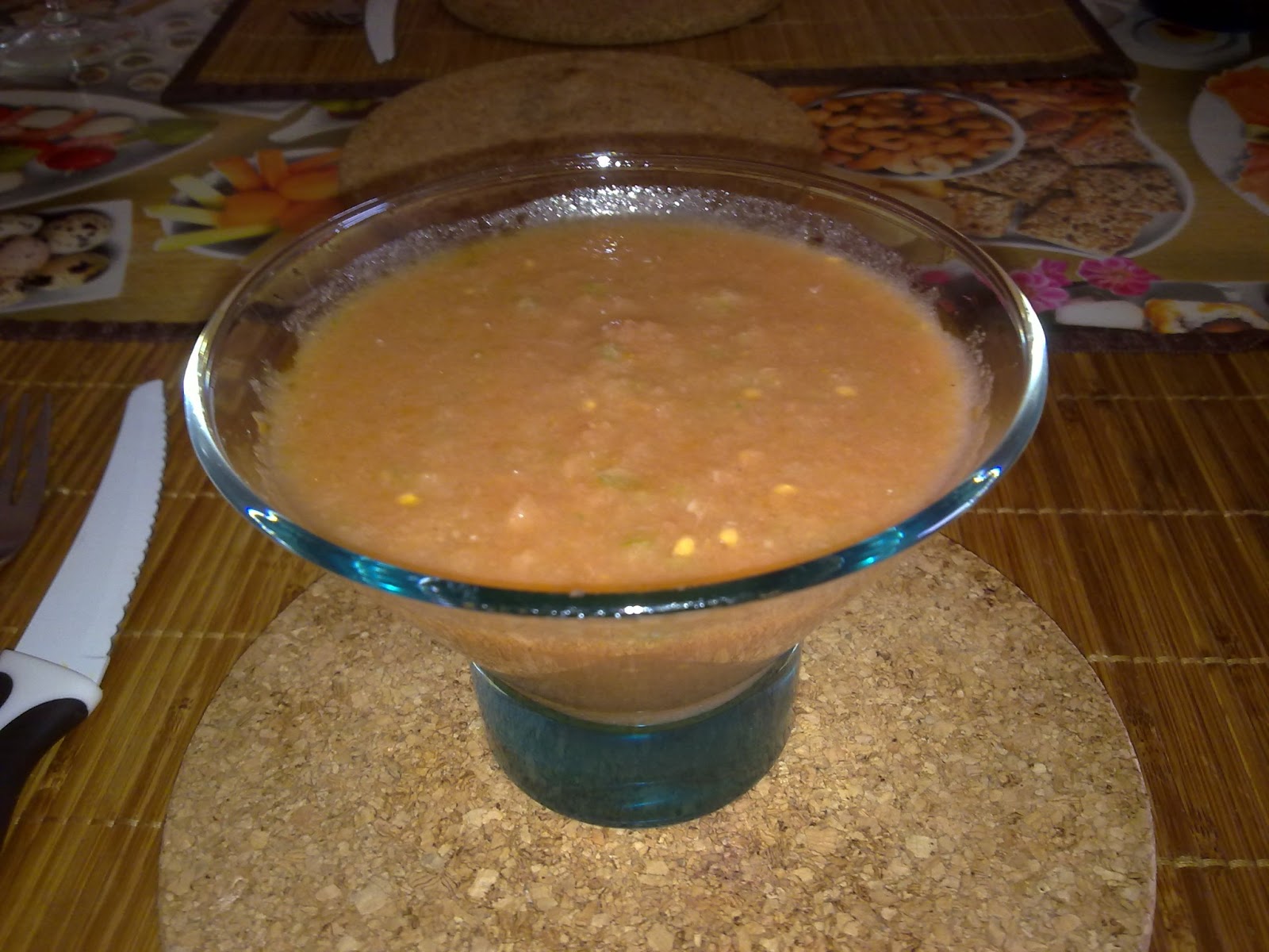Mezclamos los ingrnedientes en un bol o plato hondo grande . Y con la ayuda de una batidora, batimos hasta lograr mezclar los ingredientes y que queden lo más líquido posible. Si usamos una licuadora quedará mucho más líquido y será más fácil. Lo ponemos en el frigorífico al menos una hora para que este fresquito. Después lo podemos servir en vaso , bol o copa.
