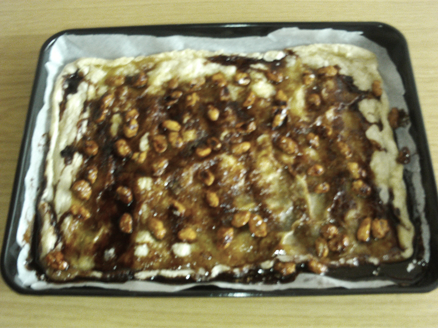 Sobre el azúcar y la canela colocamos los cacahuetes garrapiñados.