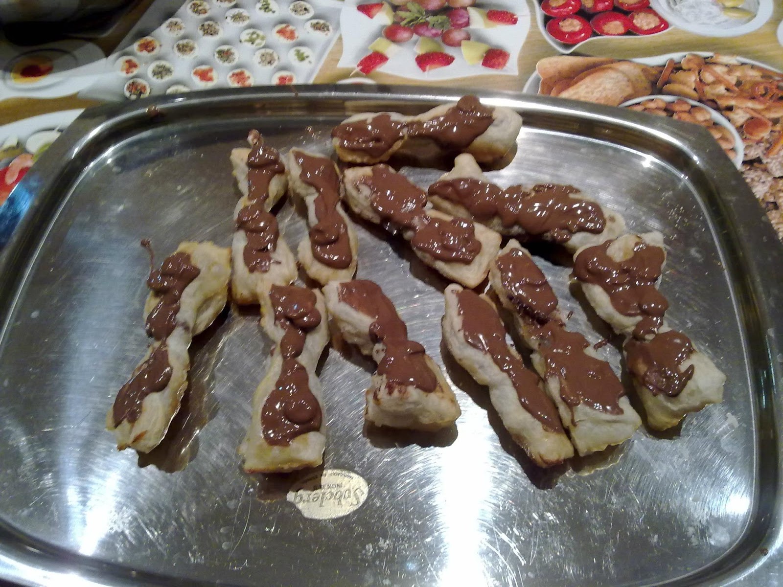Sacamos los lazitos del horno cuando estén hechos. y los ponemos en una fuente grande. Bañamos el lazito en el chocolate deshecho y lo colocamos como en la foto para que se enfríe. Después ya estarán listos para comer. calentitos o bien fríos!!!