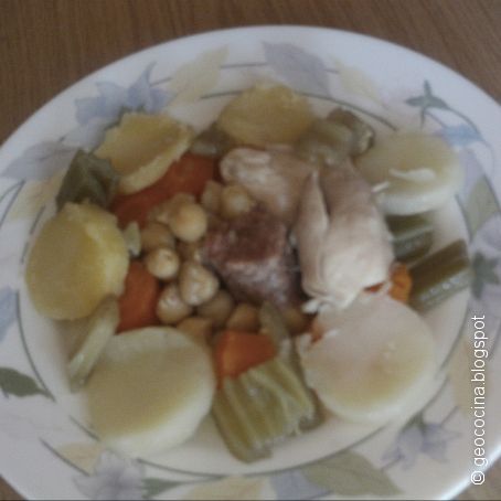 En una olla a presión colocamos el espinazo de pollo, muslos, pechugas, garbanzos (congelados), cardos (congelados), carlotas, sal ,colorante y agua hasta cubrir los ingredientes. La medida del agua viene dada por el tamaño de la olla. Tiene unas marcas en el interior y NUNCA hay que sobrepasarlas. A continuación cerramos la olla y cuando empiece a girar la válvula dejaremos a fuego medio-alto durante unos 20 o 25 minutos. Pasado este tiempo retiraremos la olla del fuego, desvaporizaremos y ya la podremos abrir para emplatar.