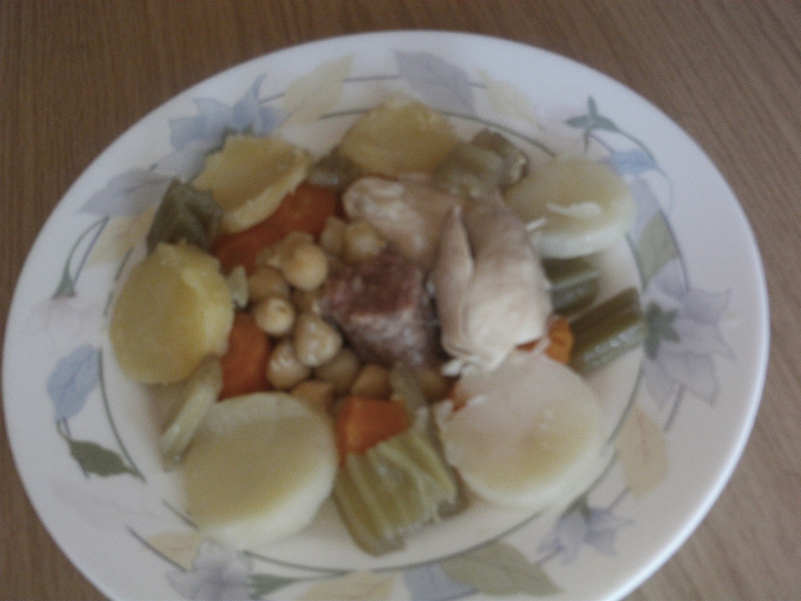 En una cacerola colocaremos unas patatas que habremos pelado y las cubriremos con el caldo del cocido. Las dejaremos hervir lentamente hasta que estén tiernas. A continuación las sacaremos y las incorporaremos al resto del guiso. En este momento ya lo podemos emplatar.