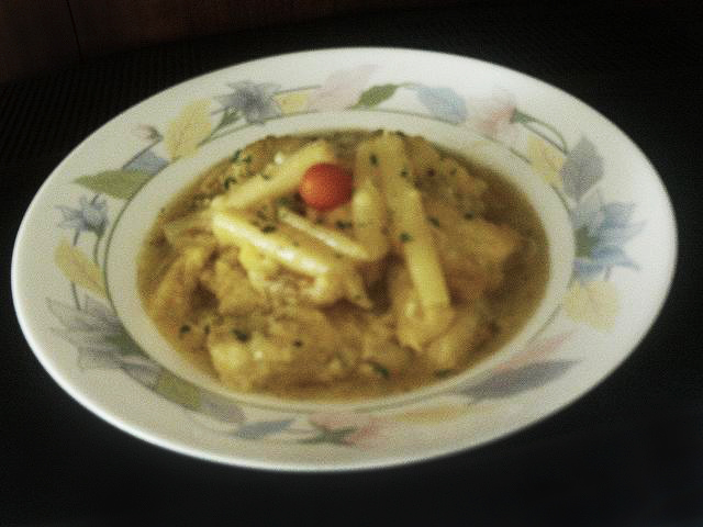 En una cacerola pondremos la merluza que hemos frito, añadimos el bote de espárragos y los champiñones laminados; luego picamos los dos dientes de ajo y lo incorporamos a la cacerola. A continuación exprimimos el zumo del limón que lo pondremos también y añadimos sal, perejil y un poco de azafrán. Cuando tengamos todos los ingredientes lo cubrimos con agua y dejamos que hierva a fuego lento hasta que tenga el punto de cocción.