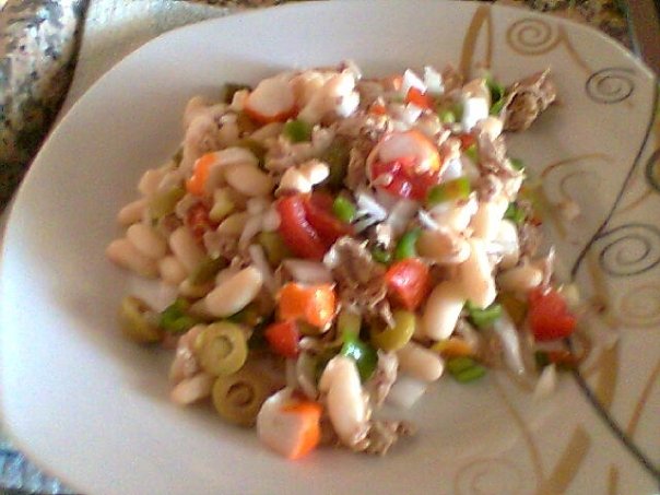 Lavamos las monchetas, sacándolas del bote y las ponemos en un escurridor. Les echamos agua y vamos lavándolas hasta que eliminen ese conservante que les ponen. Ahora, las ponemos en un plato o fuente, y añadimos el resto de ingredientes, removemos para mezclar sabores.y aliñamos, también podemos substituir el vinagre, sal y aceite por salsa mayonesa.