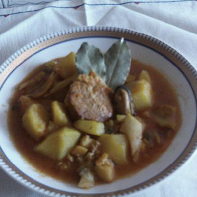 A media cocción se le añade la hoja de laurel y la media cucharada de hierbabuena. Se le añade agua hasta cubrir el guiso y se agregan las patatas, dejandolo cocer hasta que las patatas estén hervidas.