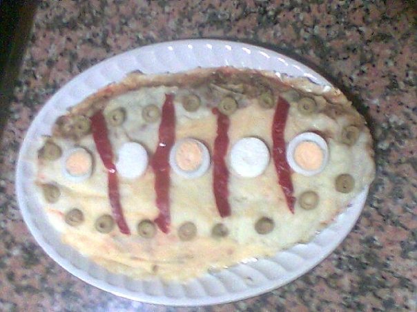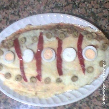 Alisa la superficie superior y espolvorea con el queso rallado y con los piñones. Introduce el pastel en el horno a 200° (solo por arriba), durante 10 minutos para que se asiente y se funda el queso para terminar decoralo con un huevo duro cortado a trozos .