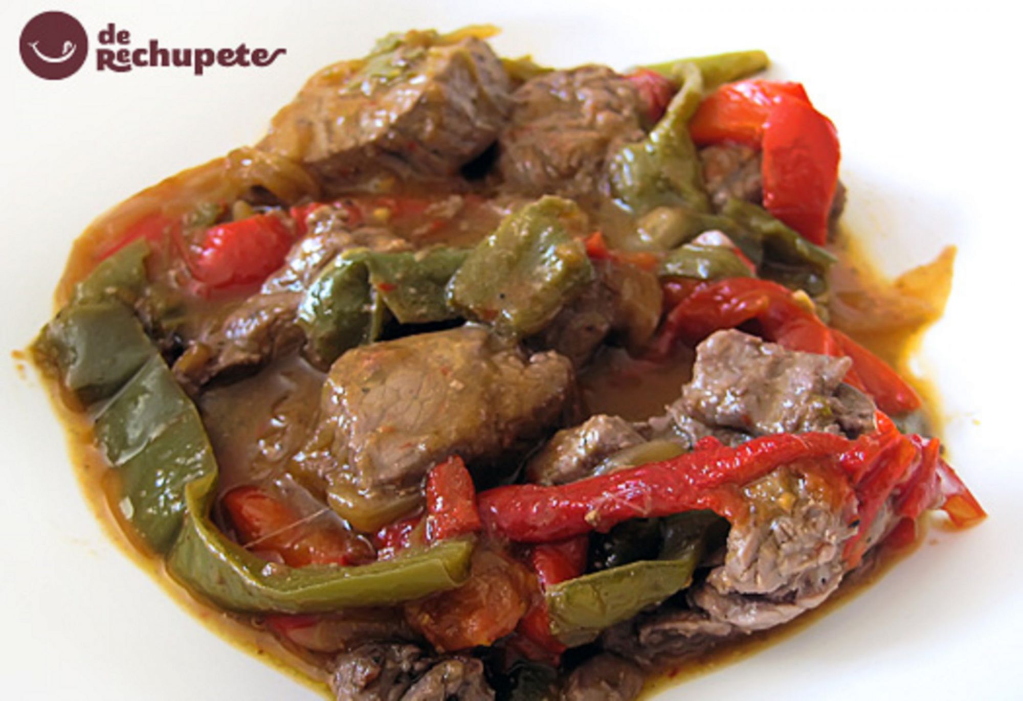 Cortamos las cebolla en medias lunas, los pimientos en tiras largas y los tomates por la mitad. Sacamos la carne de la nevera y retiramos el caldo de marinar (que vamos a utilizar para cocinar).