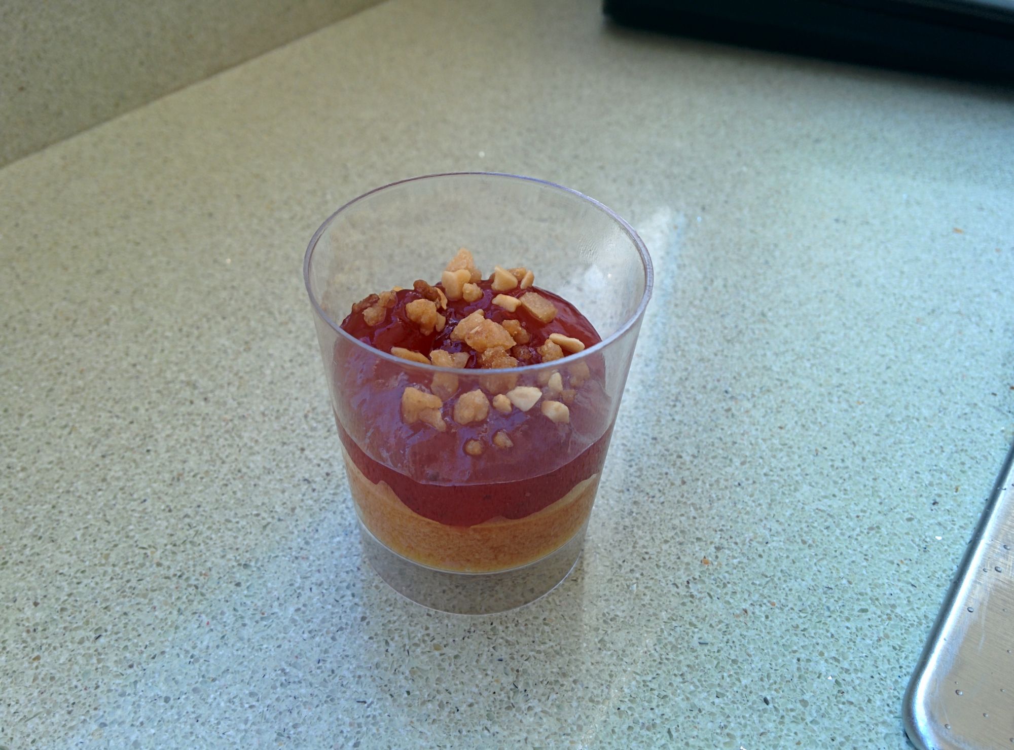 Una vez conseguido la textura adecuada, la introducimos en una manga pastelera o similar y rellenamos los vasitos de presentación a la mitad de su contenido.