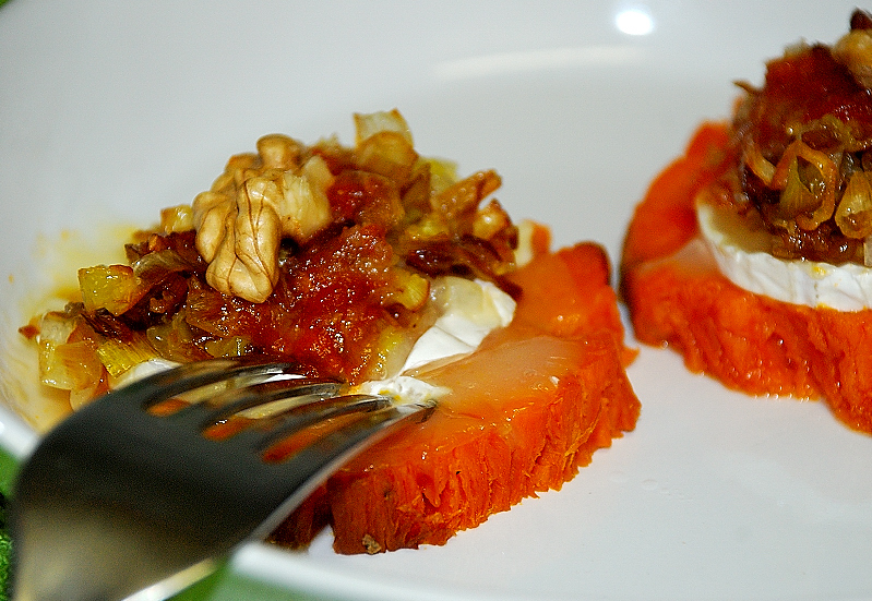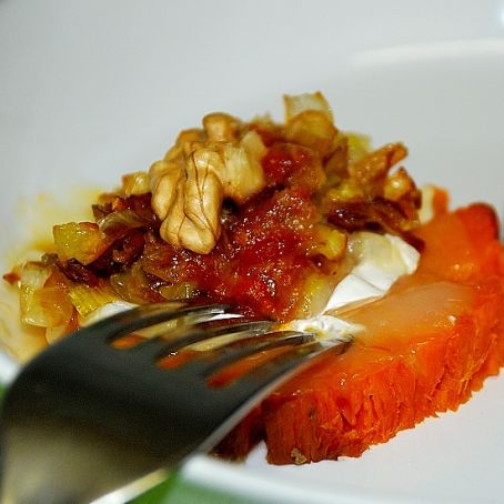 Boniato con queso de cabra y mermelada de tomate