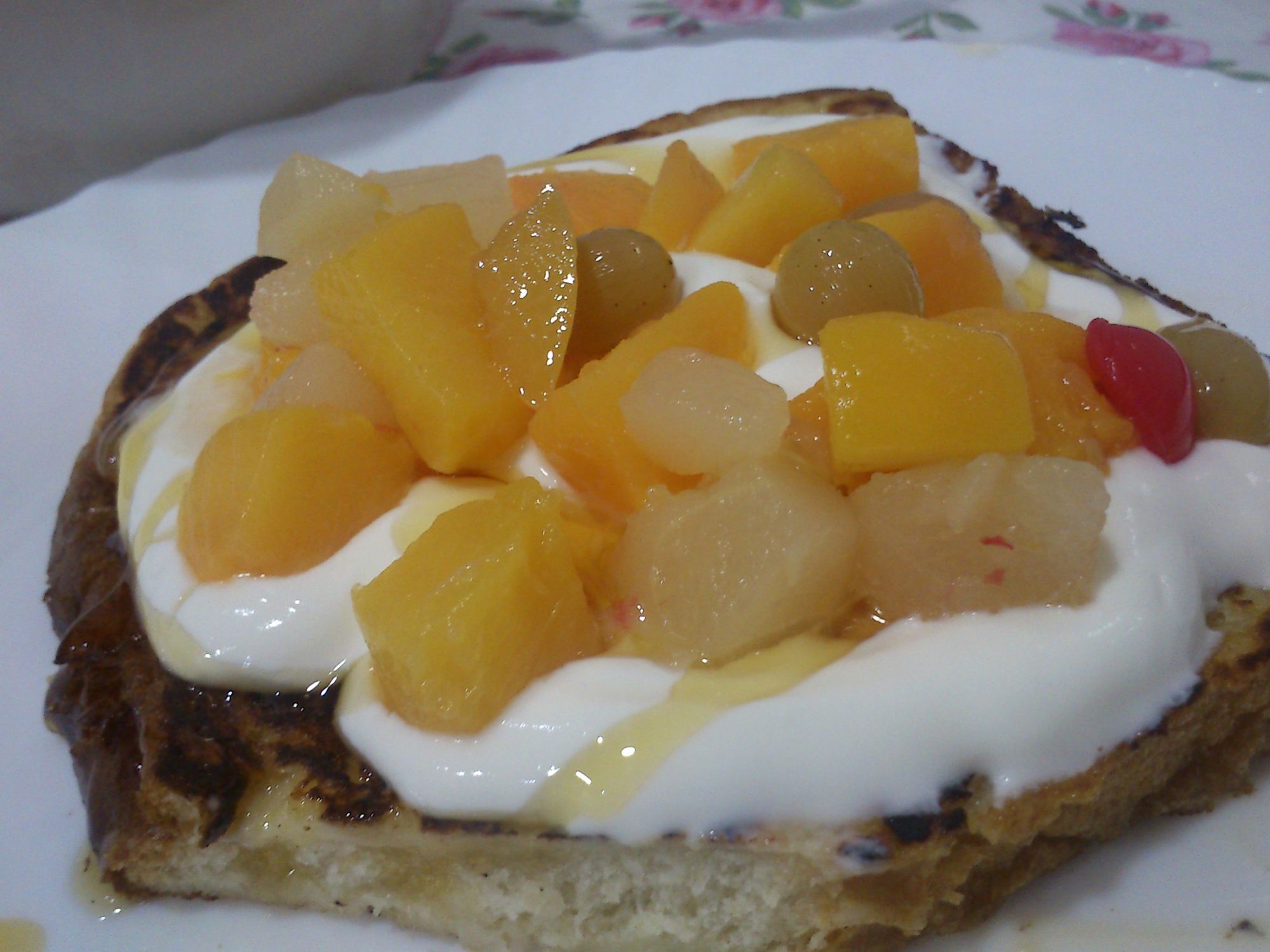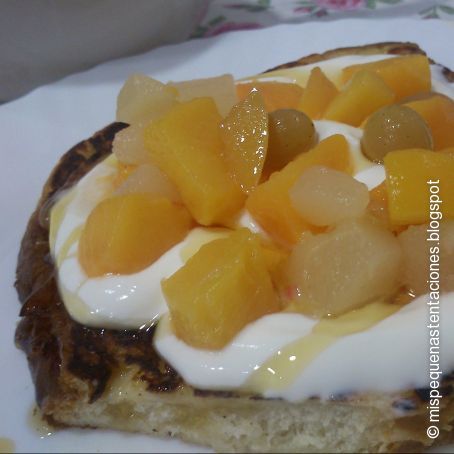 Tostadas francesas con macedona de frutas por encima. Están muy ricas, son diferentes y se hacen en un momento!