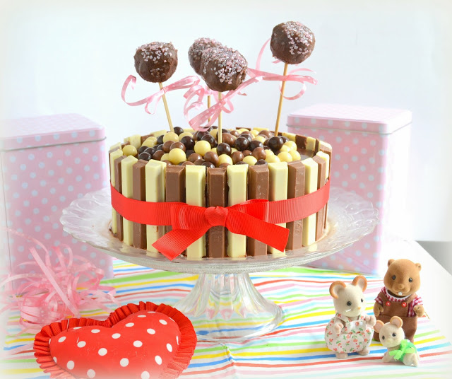 Antes de que se enfríe colocamos las barritas de kit kat, así se quedarán pegadas. Si hace falta cortamos las barritas para que coincidan con el grosor del pastel. Y rellenamos con las bolitas de chocolate o m&m's.