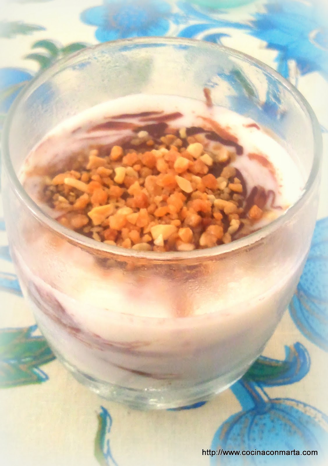 Antes de abrir el yogur lo batimos bien como si fuera una maraca. Lo vaciamos en un vaso (no muy grande) o incluso en una copa de helado.