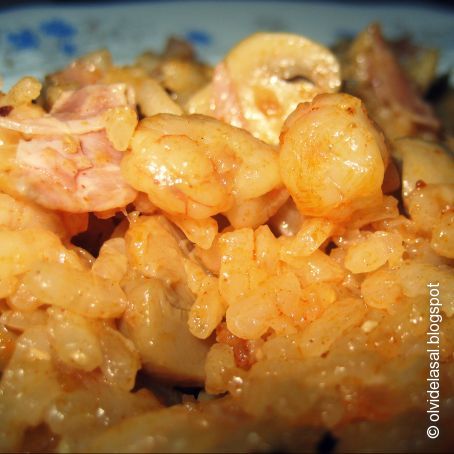 Cuando los ingredientes se hayan sofrito ligeramente, echamos el arroz y lo rehogamos hasta que su color blanco sea semitransparente. Entonces le añadimos el pimentón y le damos unas últimas vueltas.