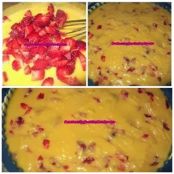 Agregamos las fresas mezclamos bien la masa, vertemos en un molde de unos 22 cm, untado con margarina y horneamos a 180° durante 30 minutos. Dejar enfriar en el frigorífico y adórnalo a tu gusto. A comer!!