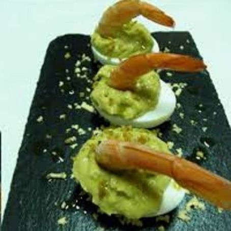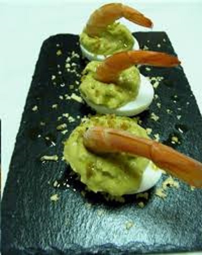 Mezclar con la yema de los huevos cocidos y la carne de los langostinos muy bien mezclados.