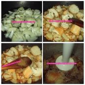 Freímos la cebolla y el ajo, cuando estén dorados incorporamos el pan.
