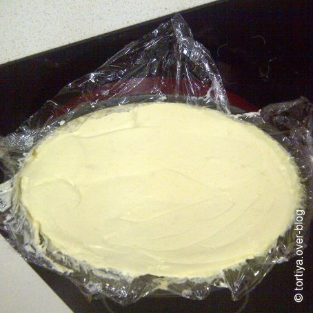 Extendemos la pasta en un molde redondo o rectangular, era la base de nuestra tarta.