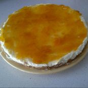 Es una tarta fría de queso tipo Philiadelfia, con chocolate blanco fundido y una capa abundante de mermelada de melocotón Hero.