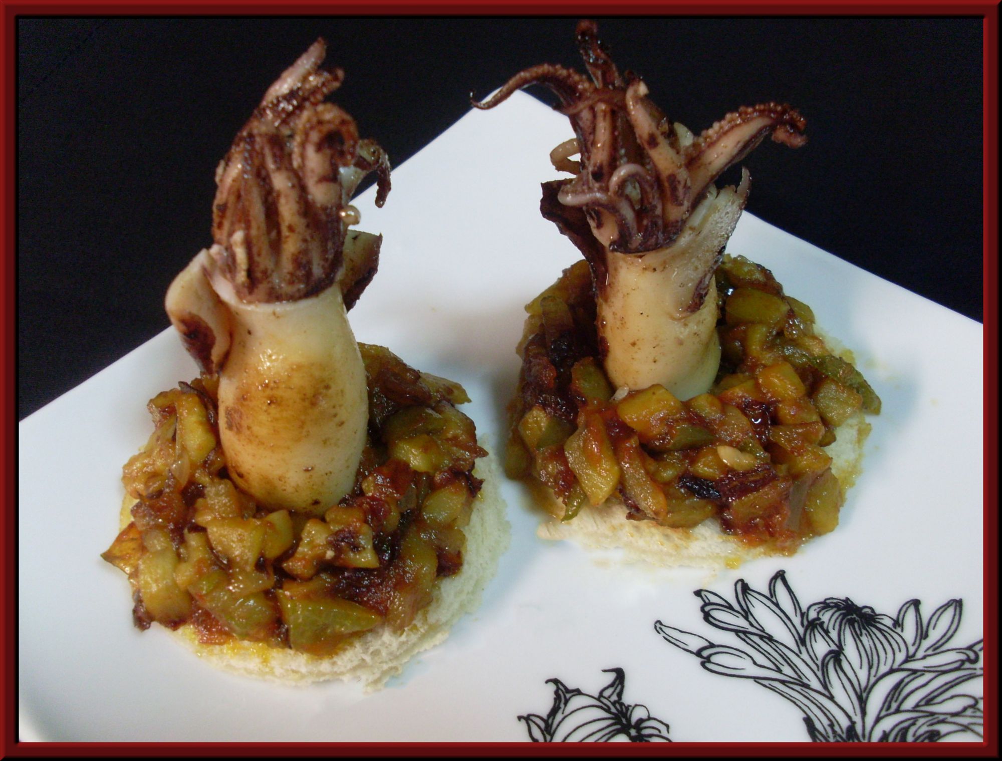 Hacemos los chipirones a la plancha.Sobre un circulo de pan que habremos tostado ponemos las verduritas pochadas, y en el centro los chipirones,