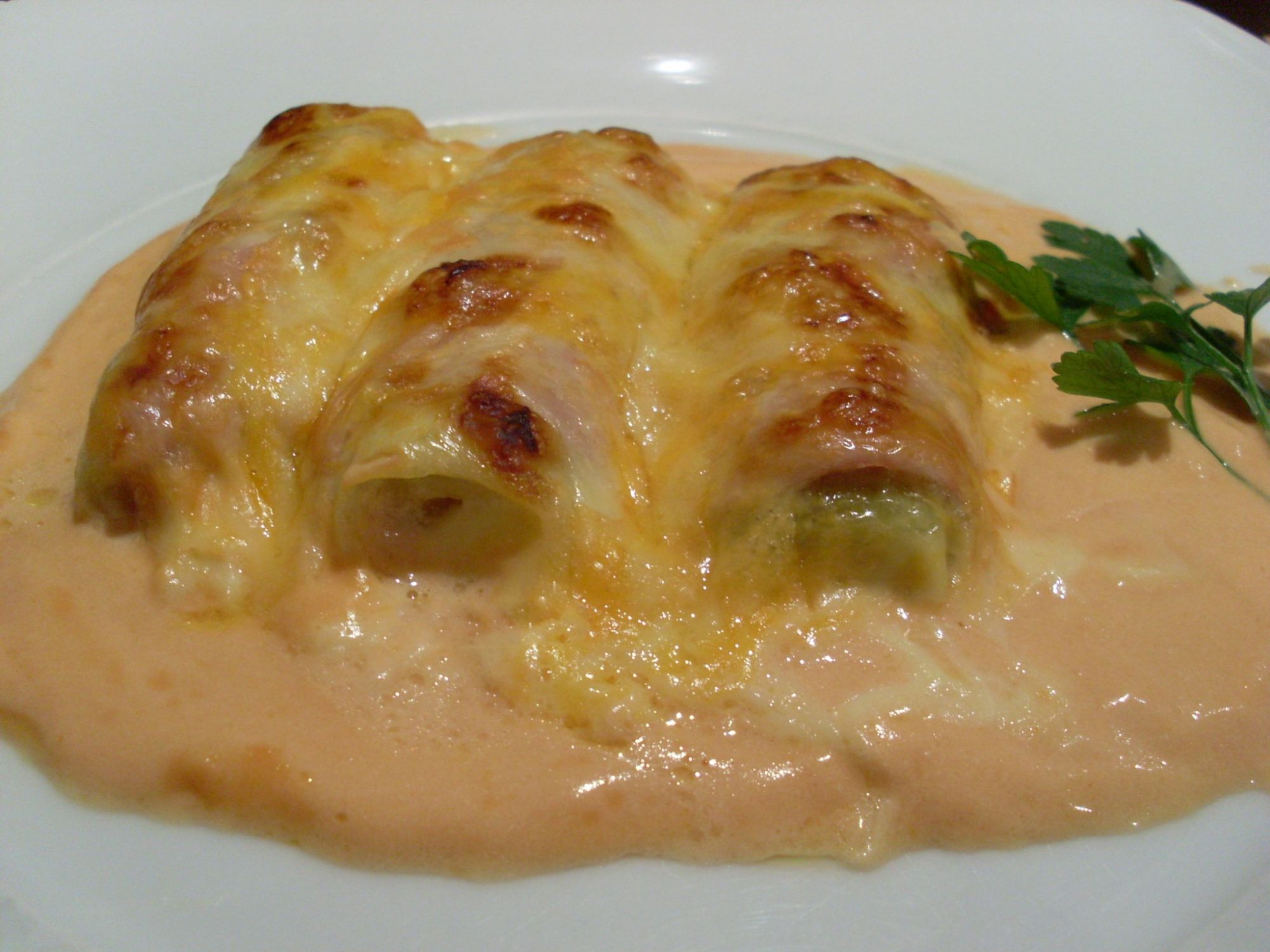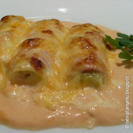 Untamos una fuente apta para horno ,con mantequilla,envolvemos cada trozo de puerro en una loncha de jamón cocido y una de queso y los colocamos en la fuente.A parte mezclamos una parte de nata y media de ketchup,la ponemos a fuego lento y dejamos reducir un poco hasta obtener una crema.Cubrimos con esta crema los puerros,echamos mozzarella y gratinamos