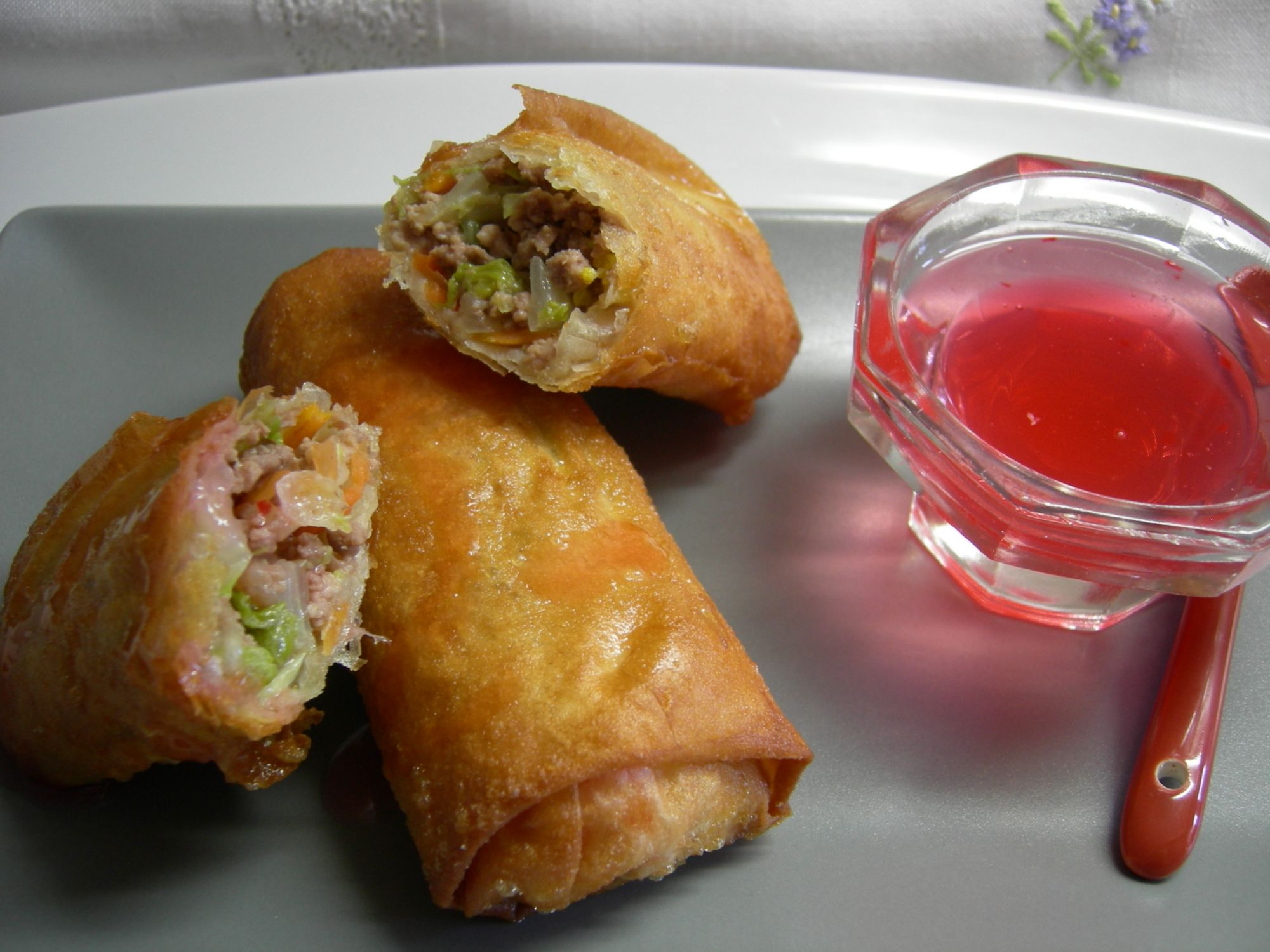 Pincelamos con un poco de agua o huevo batido, el cierre para que se quede sellado y no se nos abra y freímos en aceite muy caliente hasta que estén dorados. Los sacamos sobre papel absorbente para que suelten el exceso de grasa y servimos calientes y acompañados de salsa agridulce.