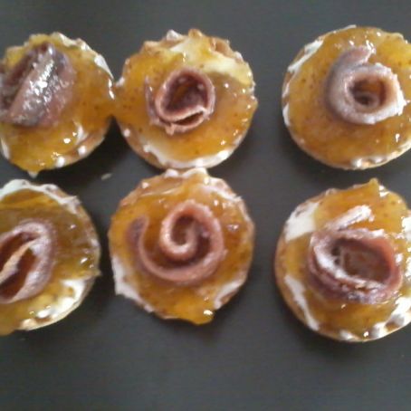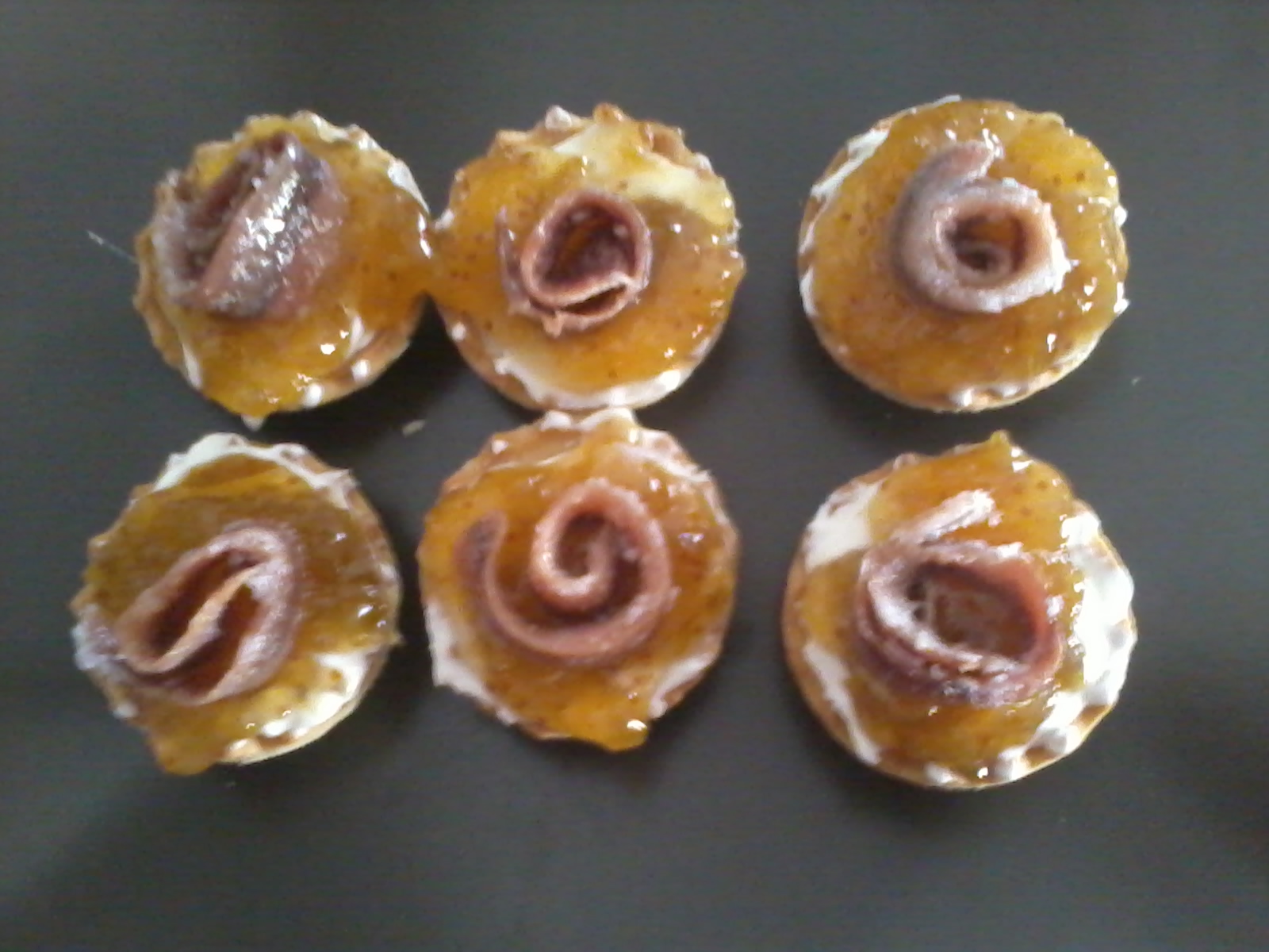 Poner en cada tartaleta un poco de queso fresco, encima una cucharadita de mermelada de higos y por encima una anchoa.