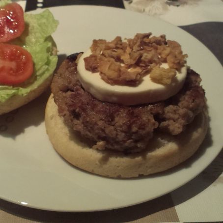 Con la carne picada y la especias (yo la salpimento y le pico el ajo y el perejil) formamos una hamburguesa con las manos (que no sea demasiado gruesa, de ser así le costaría más hacerse bien en la sartén), y la hacemos a fuego lento en una sartén con dos cucharadas de aceite, para que se haga bien.