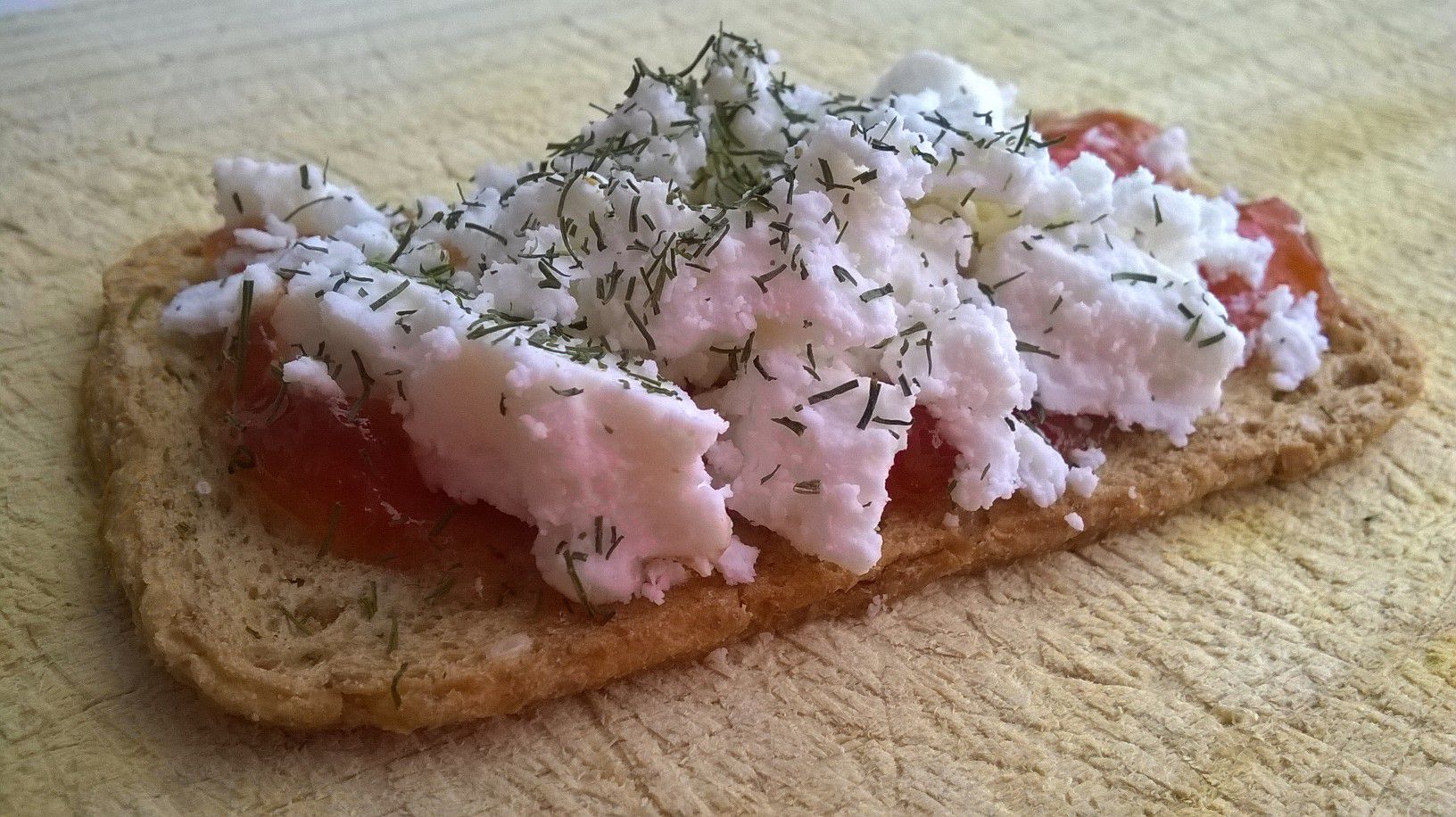 Tosta de pan integral con confitura de tomate y sobre la confitura lleva desmigado queso de cabra de rulo. Terminamos nevandolo con eneldo al gusto