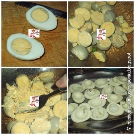 En primer lugar partimos los huevos por la mitad.Vamos sacando las yemas y las reservamos en una fuente honda. Chafamos(aplastamos) con un tenedor todas las yemas.