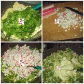 Incorporamos la lechuga.Partimos los palitos en trocitos pequeños( reservamos un poco para decorar),Agregamos a las yemas.A continuación iremos agregando mayonesa hasta lograr la textura deseada.