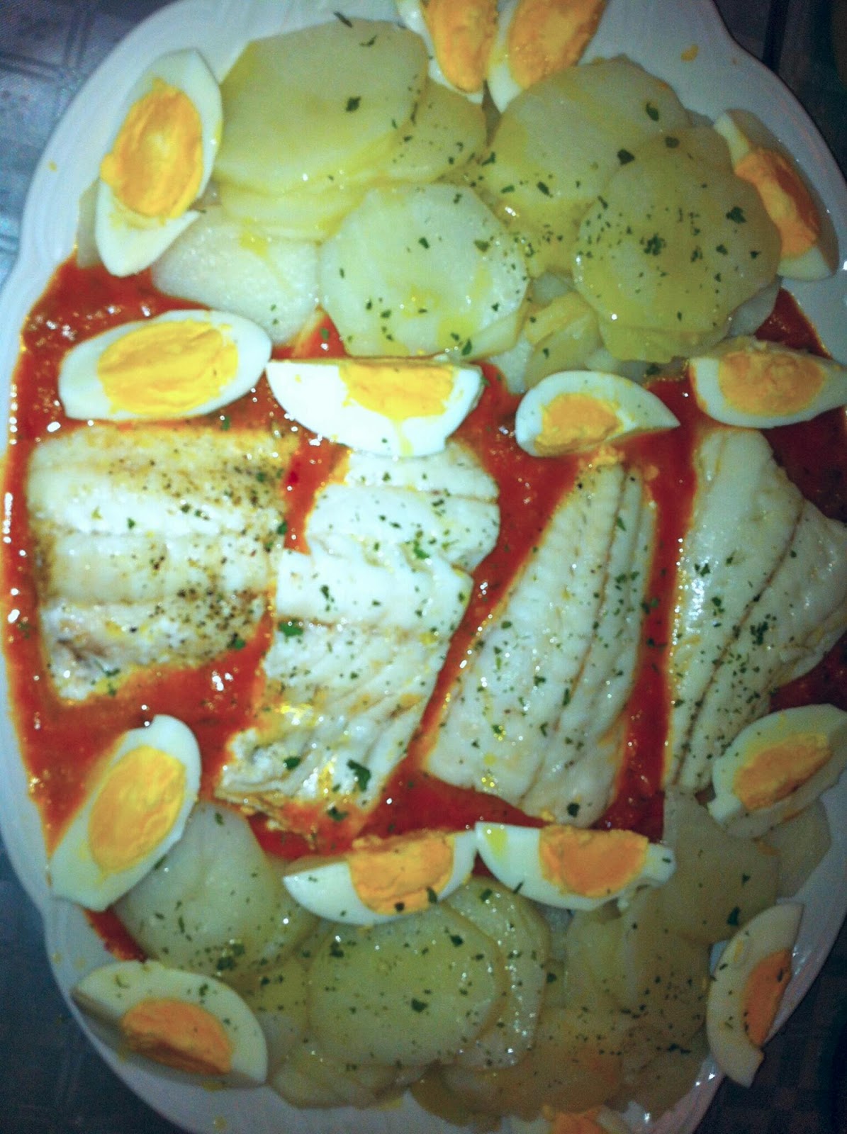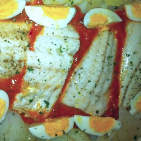 Retira el varoma, desenvuelve los huevos, pélalos y cortalos. Desenvuelve las lubinas, quitales la piel y las espinas. Sirve inmediatamente con el pisto, las patatas y los huevos
