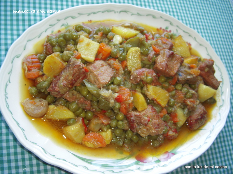 Nota: Si la menestra se hiciera con carne, cuando ponga la mariposa tendría que incorporar la carne en el lugar del pollo, y antes de añadir las verduras tendría que incorporar el agua y la sal, programar 15 minutos, temperatura varoma, giro a la izquierda, velocidad cuchara. Cuando termine, añadir las verduras