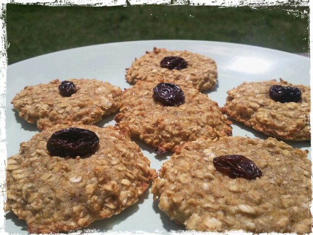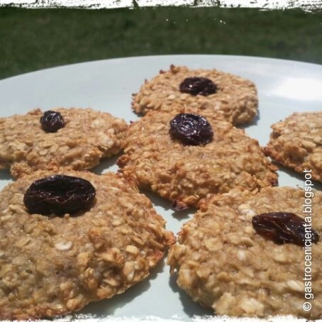 Machacamos el plátano hasta hacer un puré, lo mezclamos con la avena hasta hacer una masa consistente, precalentamos el horno a 175°, en una bandeja de horno ponemos una hoja de papel de horno, y vamos poniendo una cucharada de pasta por cada galleta dándole forma redondida y no demasiado aplastada...culminamos con una pasita encima. Metemos a hornear 15 minutos más o menos hasta que estén los bordes doraditos.