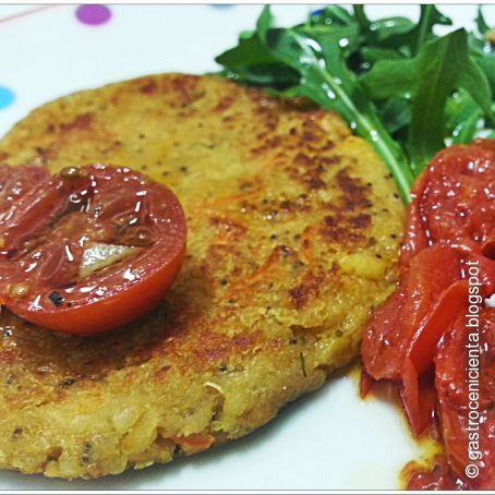 En una sartén ponemos unas gotas de aceite de oliva virgen y vamos poniendo montoncitos de masa, sellamos, aplastamos con una espátula dándole forma de hamburguesa y vamos reservando en un plato.