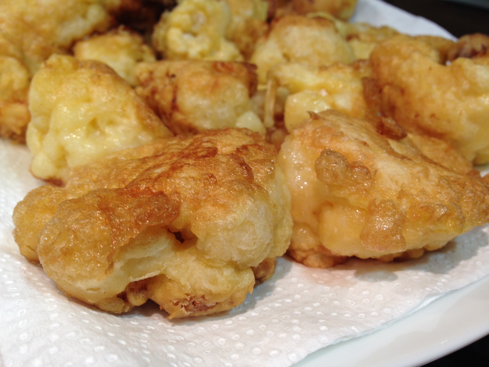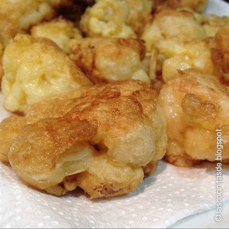 En una sarten con aceite bien caliente iremos poniendo la coliflor rebozada. Daremos unas vueltas y en cuanto cambie de color las retiramos a un plato con unas servilletas para retirar el exceso de aceite.