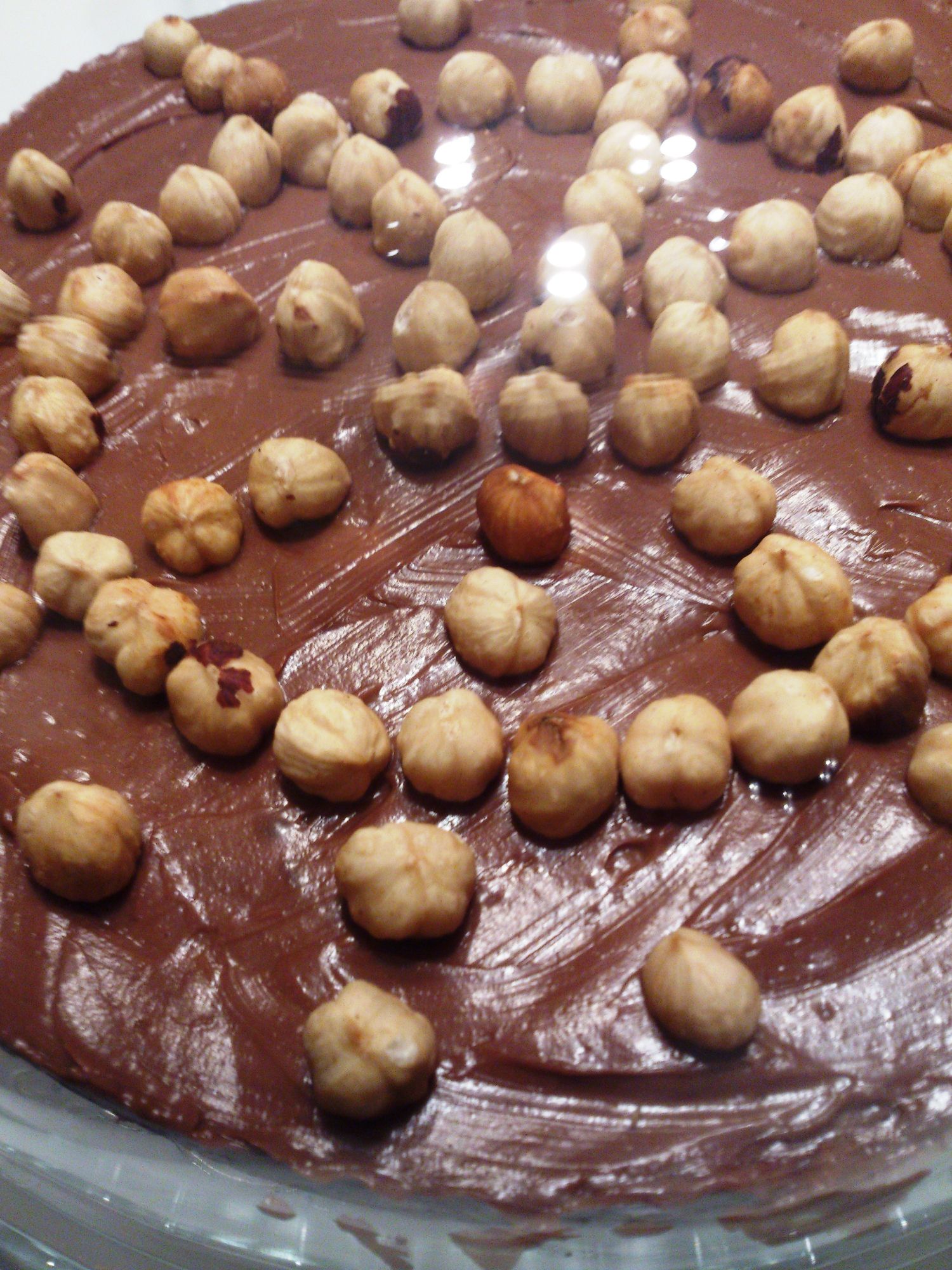 Sacar el molde de la nevera y verter cuidadosamente la crema de Nutella sobre la galleta, extender con una cuchara o espátula y decorara con el resto de avellanas picadas (yo las puse enteras porque había gente que no las podía comer)