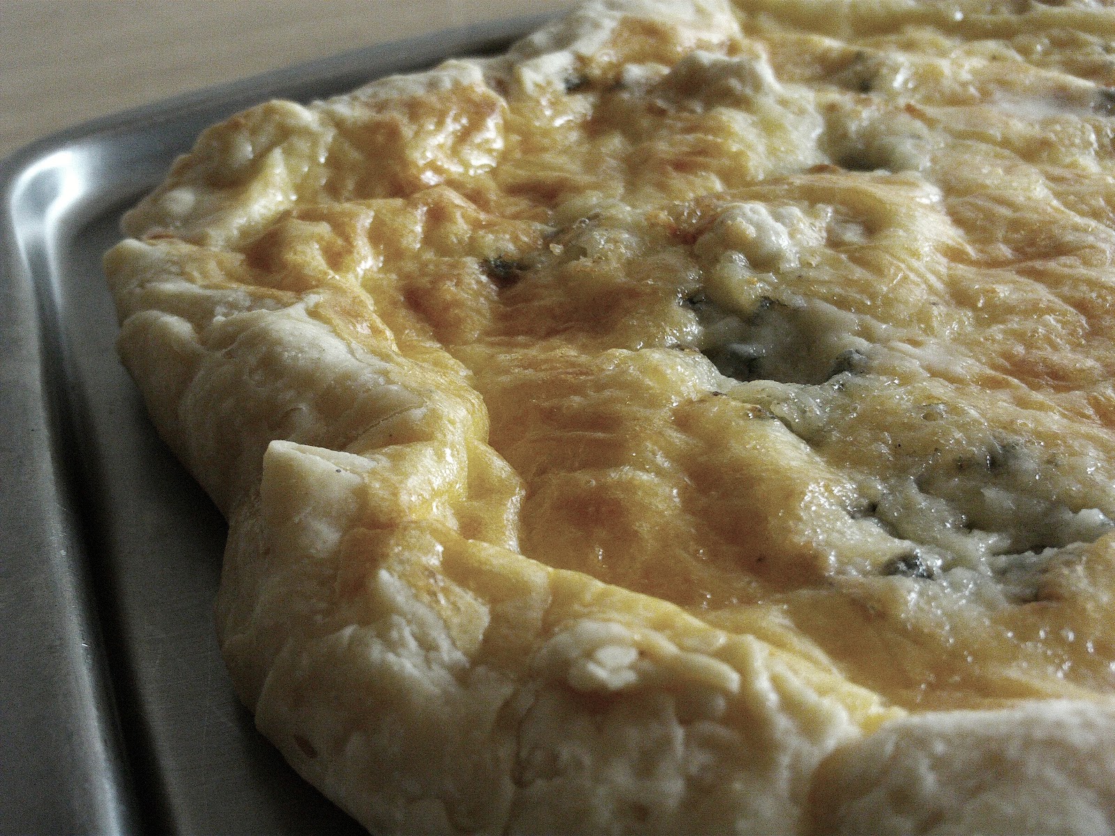 Sobre una placa de horno con papel vegetal, para evitar que se pegue la galette, colocamos la masa y vamos levantando los bordes dándoles la forma redonda e irregular tal como se aprecia en la foto. A continuación vertemos la mezcla en el bol, colocamos los daditos de queso roquefort y espolvoreamos con queso emental. Doblamos los borde de la masa hacia el interior y lo horneamos a entre 180 y 200 grados durante unos 15 o 20 minutos y a continuación encendemos el grill durante 2 o 3 minutos más. El tiempo de cocción siempre es aproximado, pero para que tengáis una idea, estará listo cuando el relleno de la galette esté compacto y quede a modo de tortilla.
