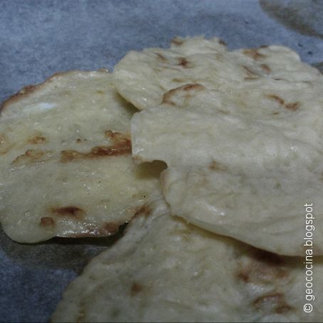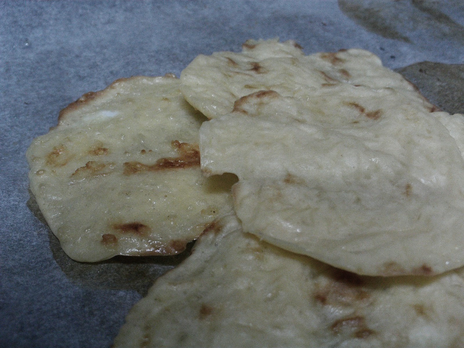 En una bandeja de horno cubierta con papel vegetal iremos echando una cucharada de la mezcla anterior y lo aplanaremos con la cuchara dándole forma redonda, y que quede lo más finamente posible. Repetiremos la operación tantas veces como tortitas queramos, dejando un hueco entre ellas para que no se peguen.
