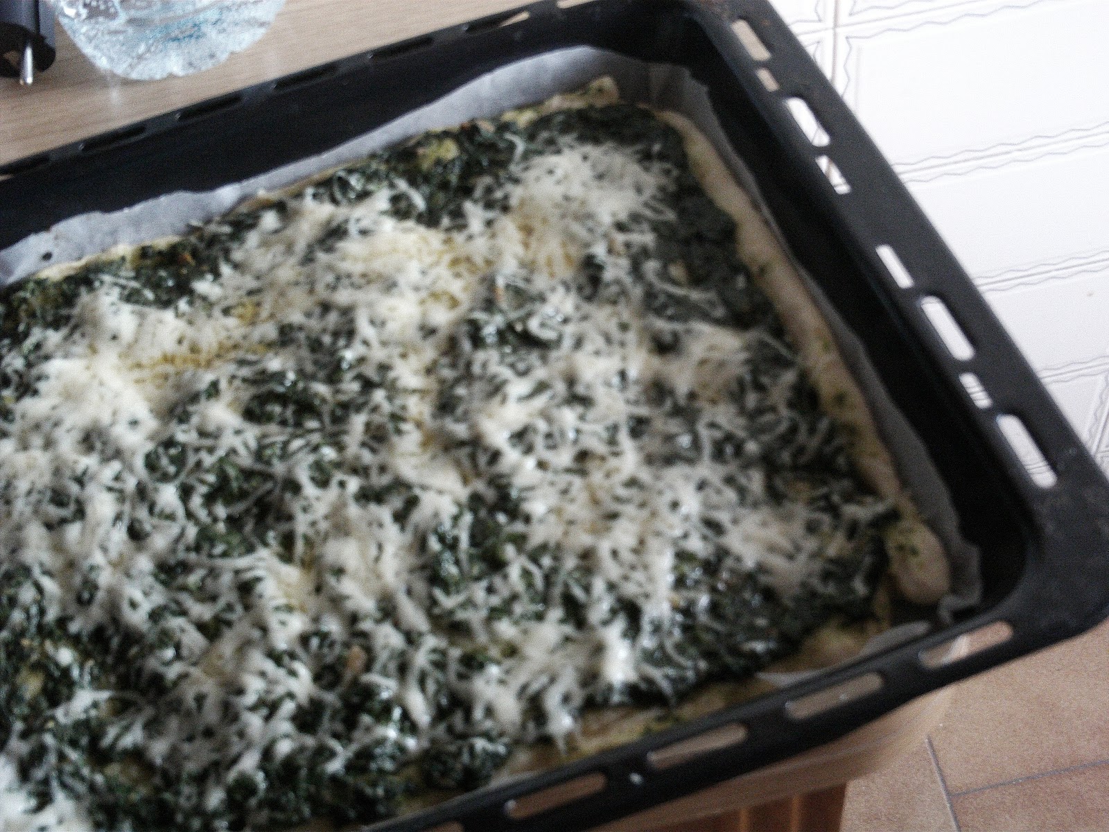 Sobre la masa que la tendremos en una fuente de horno con papel vegetal, echaremos las espinacas y cubriremos con abundante queso rallado, y colocaremos en el horno a 180° durante 20 o 30 minutos aproximadamente.