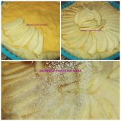 Pelamos las manzanas en gajos no muy finos ni muy gordos y empezamos adornar. Una vez que ya tengamos la tarta entera adornada le agregamos azúcar por encima