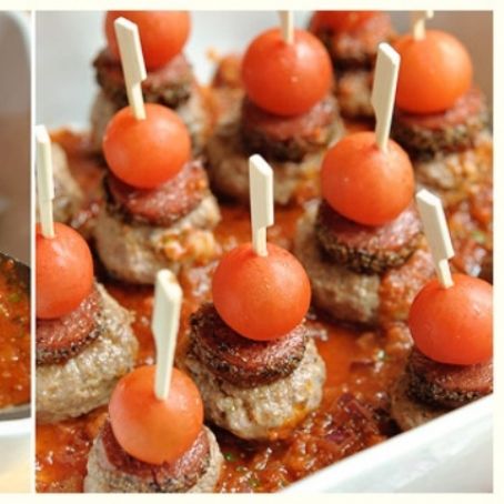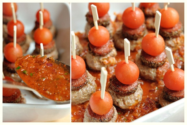 Con unos pinchos de tapas, coloque un tomate cherry en la parte superior del salami y debajo de éstos la hamburguesa.