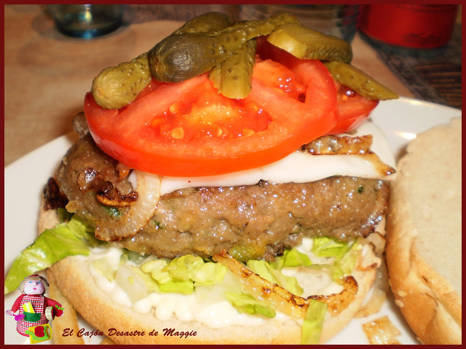 Para montar la hamburguesa poner las dos mitades del pan tostado en el plato. Sobre la mitad plana poner la mayonesa cubriendo todo el pan. A continuación disponer la lechuga picada, la hamburguesa, la cebolla frita, las rodajas de tomate y los pepinillos y cubrir con la otra mitad del pan. Servir acompañada de patatas fritas.