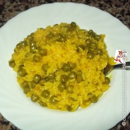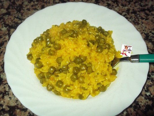 Ponemos en la olla el aceite y sofreímos el pimiento y los dientes de ajo. Agregamos el tomate y sofreímos un poco.Si en casa no les gusta encontrase los pimientos y tal le dais una pasada de batidora y listo y agregamos los guisantes.Seguidamente agregamos la sal, la pimienta y la pastillas de caldo.A continuación ponemos el colorante y mezclamos.Agregamos un poco de agua. Cerramos la olla unos 10 minutos.Y ya tenemos los guisantes listos. Agregamos el arroz si vemos que necesita agregarle un poco de agua la incorporamos y cerramos de nuevo la olla por unos 5 minutos.Y ya tenemos nuestro arroz con guisantes