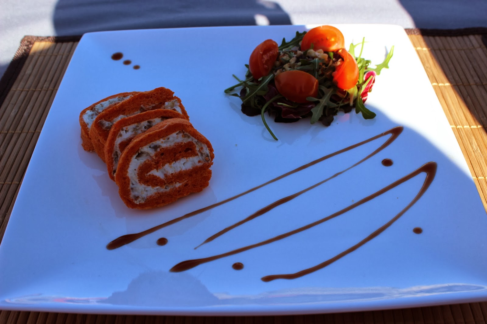 Tronco de pimiento del piquillo relleno de torta del casar, nueces y jamón