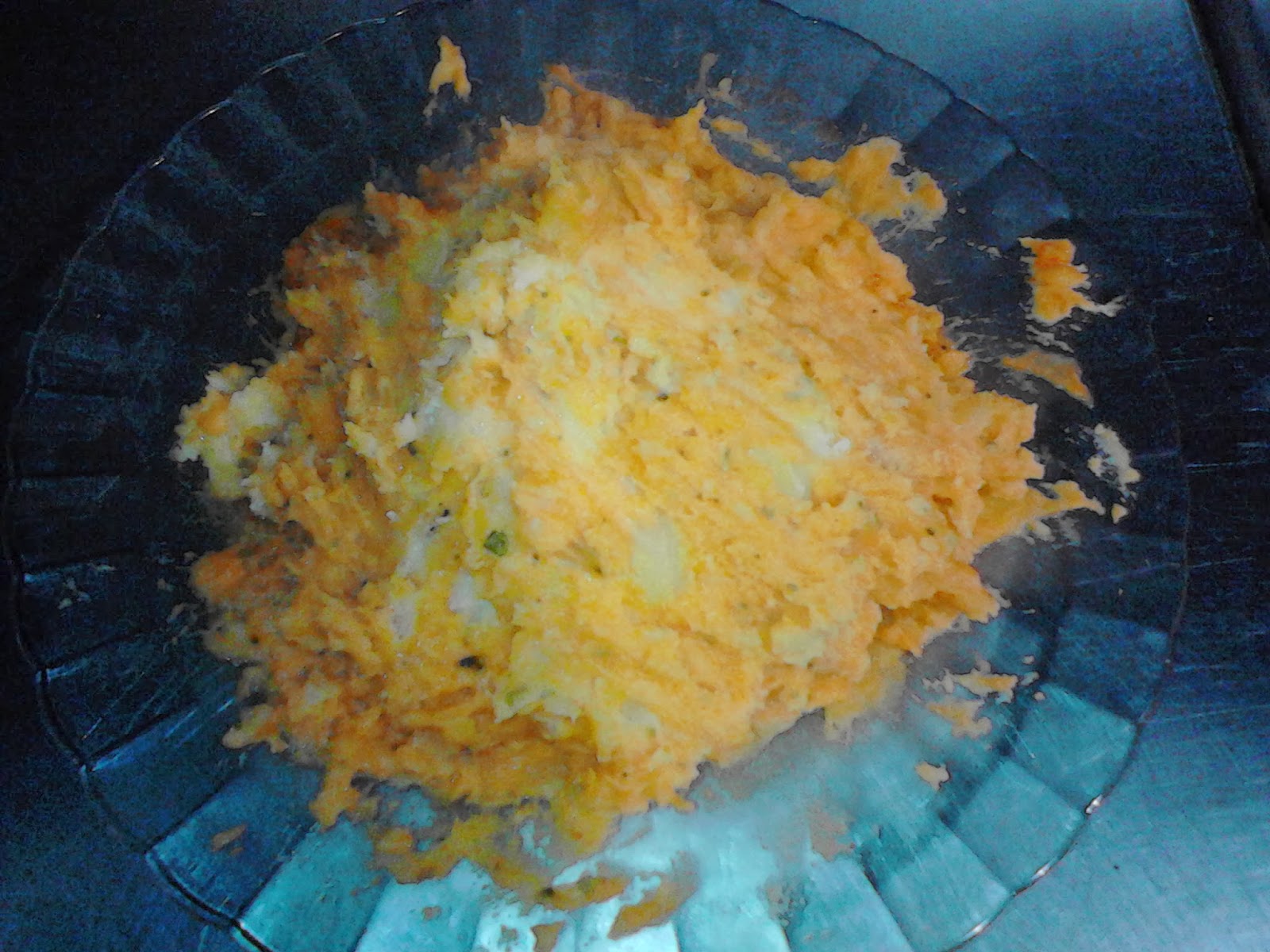Ya tenemos las patatas blandas, quitamos el agua. Cuando tengamos quitado el agua ponemos dos lonchas de queso cheddar encimas de las patatas para que se vaya fundiendo. Ahora en la misma cacerola echamos un poco de aceite y vamos aplastado las patatas con el queso cheddar hasta que queda de forma de puré. Ahora echamos orégano y tomate frito. Empezamos a remover todo a fuego lento hasta que veamos que toda la patata ha cogido el color del tomate.