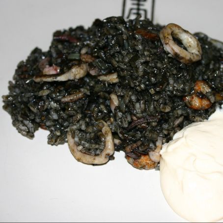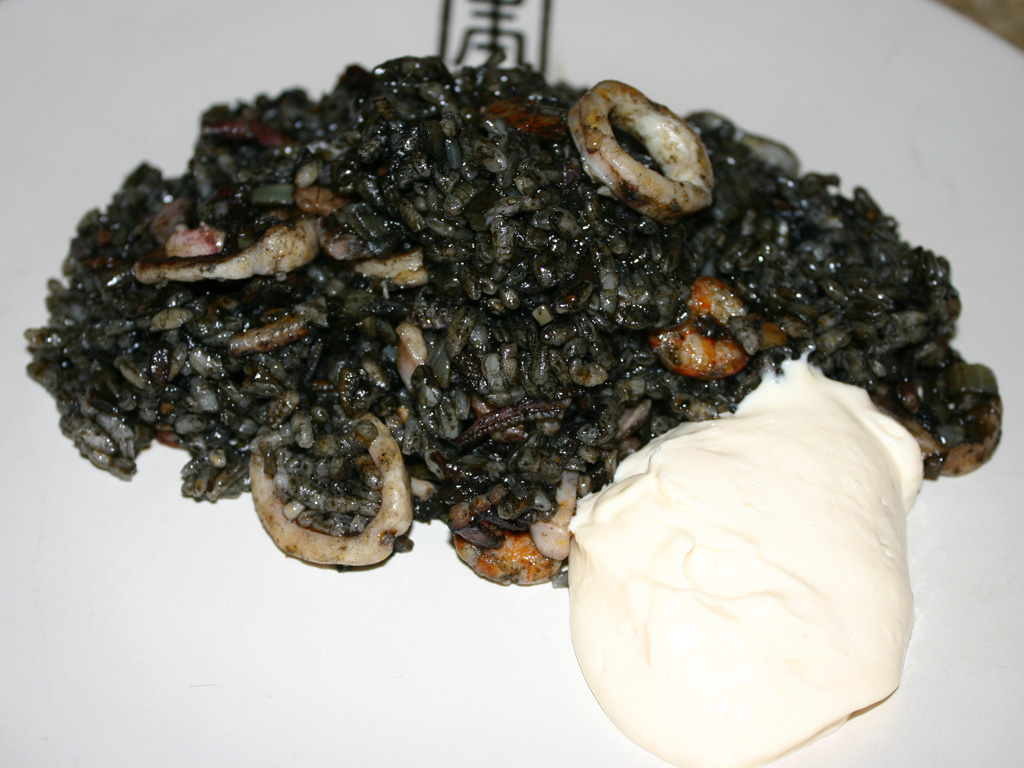Se sofríe un minuto el conjunto y se añade el caldo hirviendo, la tinta de calamar disuelta en un poco de caldo y se rectifica de sal.
