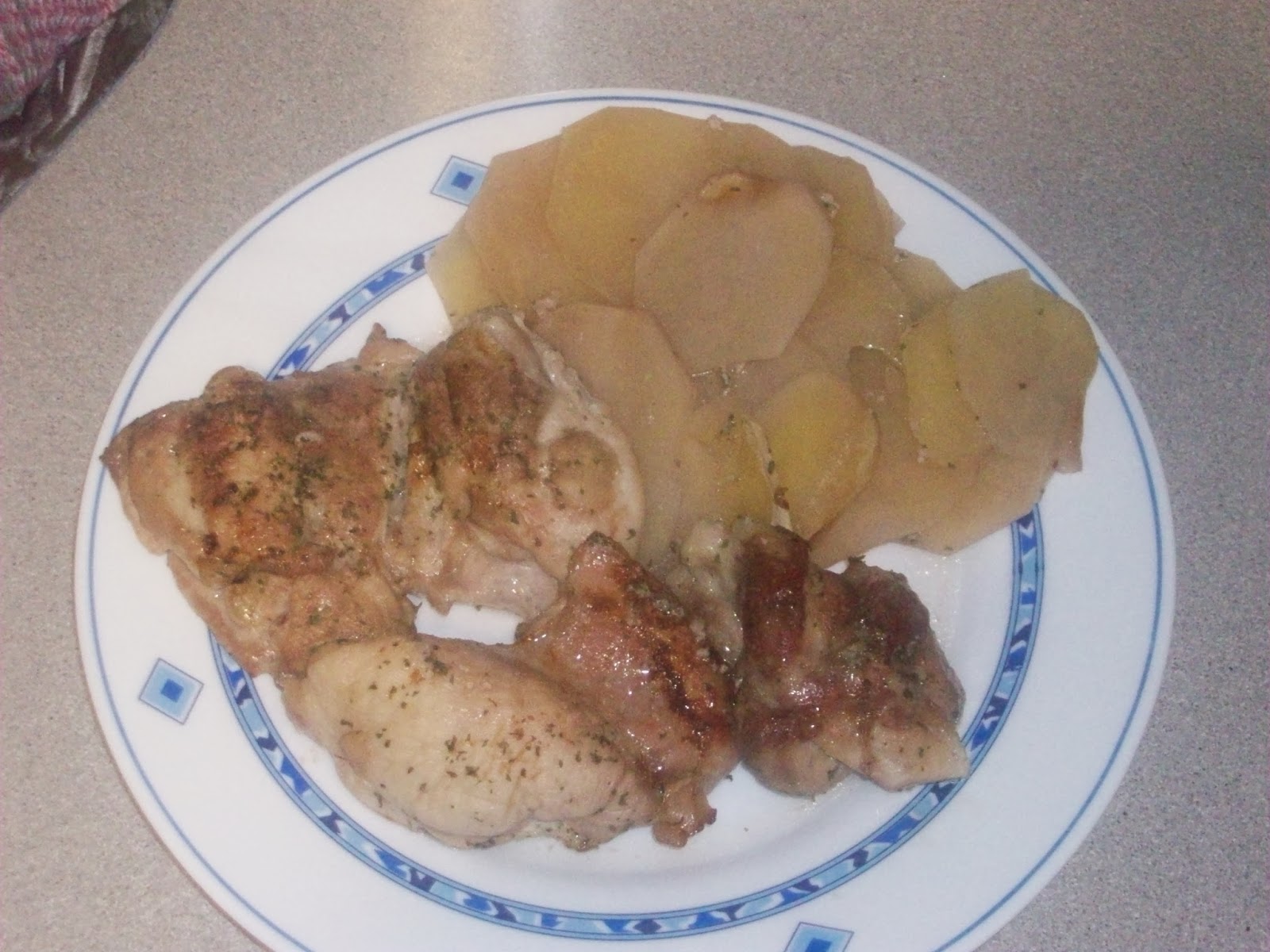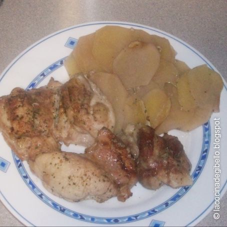 Cuando tengamos las patatas en la base, Cogemos los contramuslos , los sazonamos con perejil, ajo en polvo y sal, lo ponemos encima de las patatas y echamos dos vasos de vino Lambrusco.